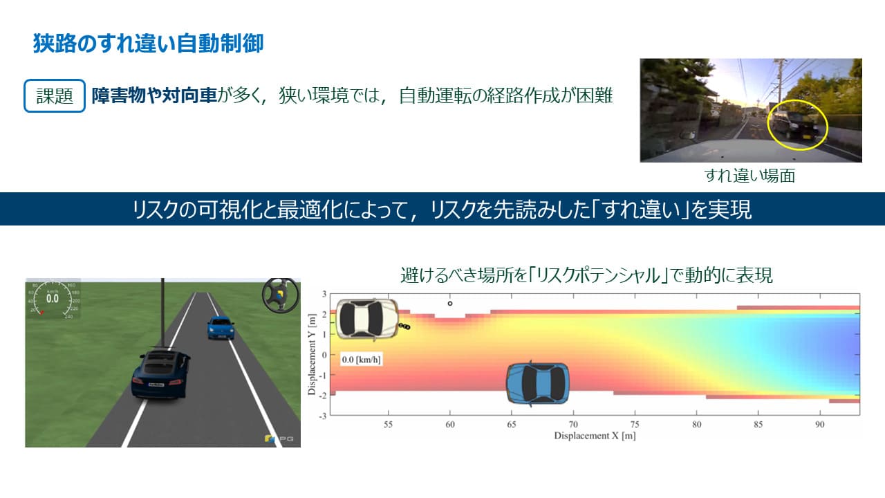 自動運転技術の発展より、LKASやACCが実用化されているが、市街地のような動的かつ狭い環境への適用は依然として課題が残されている。
