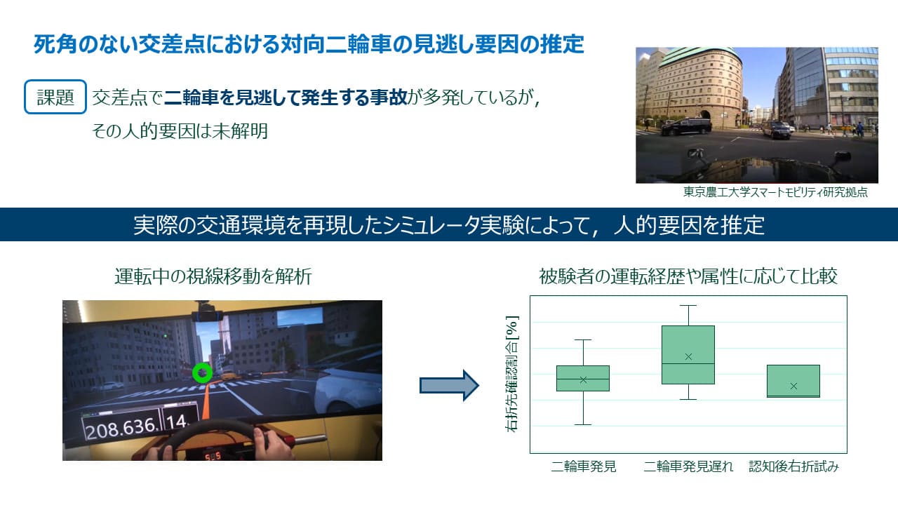 被験者実験を通じて視線行動や運転操作等のデータを解析することで事故発生要因の理解を深化させ、二輪車視点に基づく防衛運転方策の創出を目指している。
