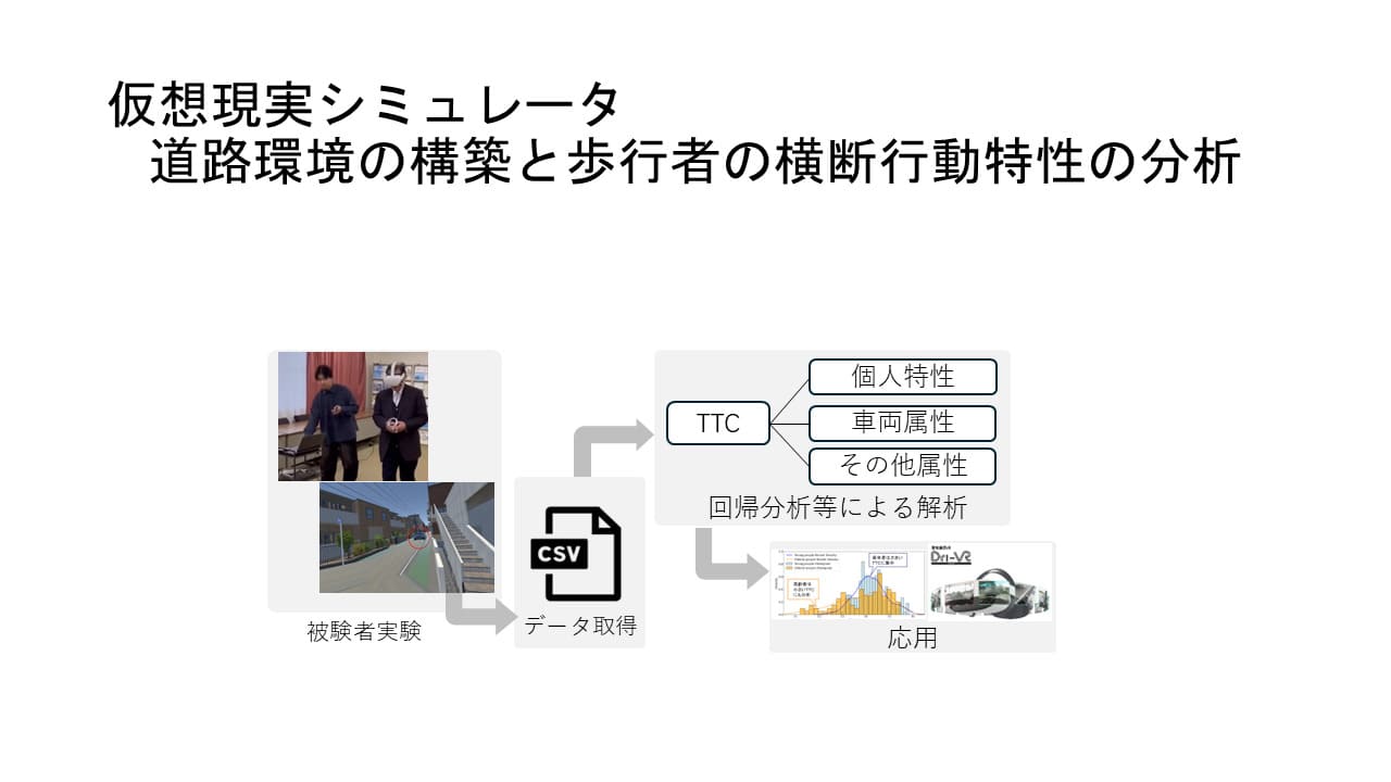 本研究で構築したVR基盤は、高齢者のリスク認知を高めるための横断教育への応用が可能であるとともに、個人特性を考慮した横断判断モデルの構築にも有効である。これにより、交通安全施策の高度化に加え、ADASや自動運転システムにおける歩行者行動の理解・評価への貢献が期待される。