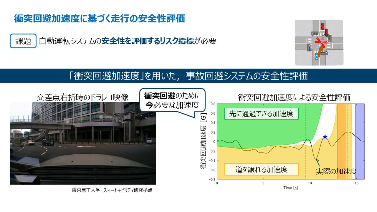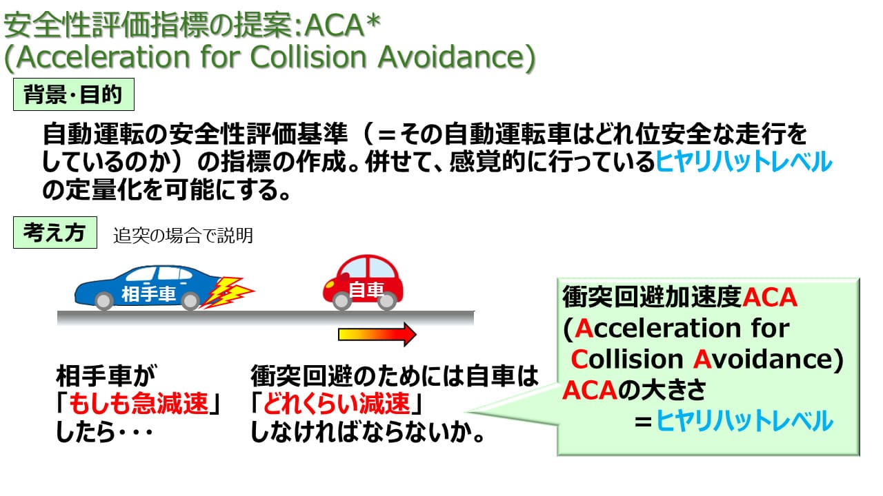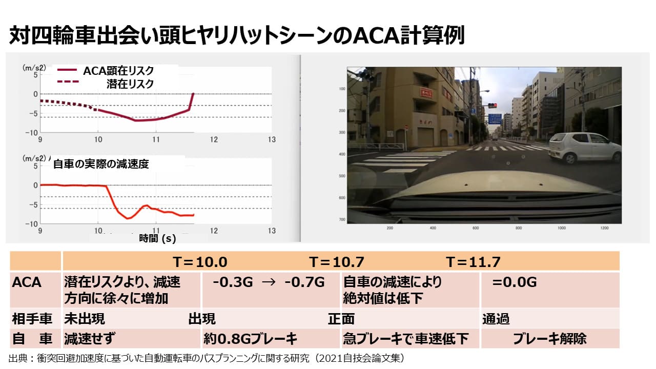 その結果、ACAはリスクシナリオにおける自動運転システムの走行安全性評価基準として有効であることが示された。今後は、ACAを用いた安全性評価手法を自動運転システムの評価に適用していく予定である。